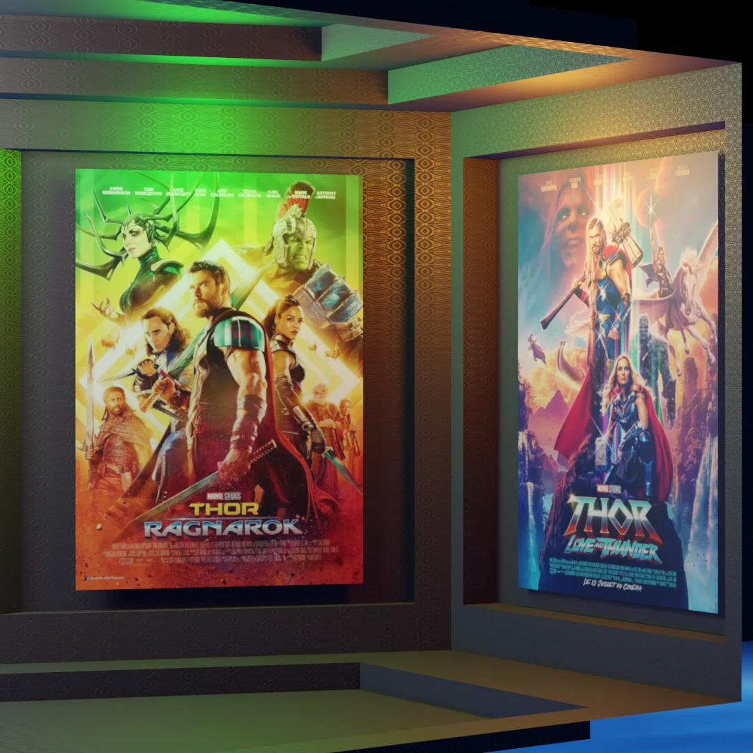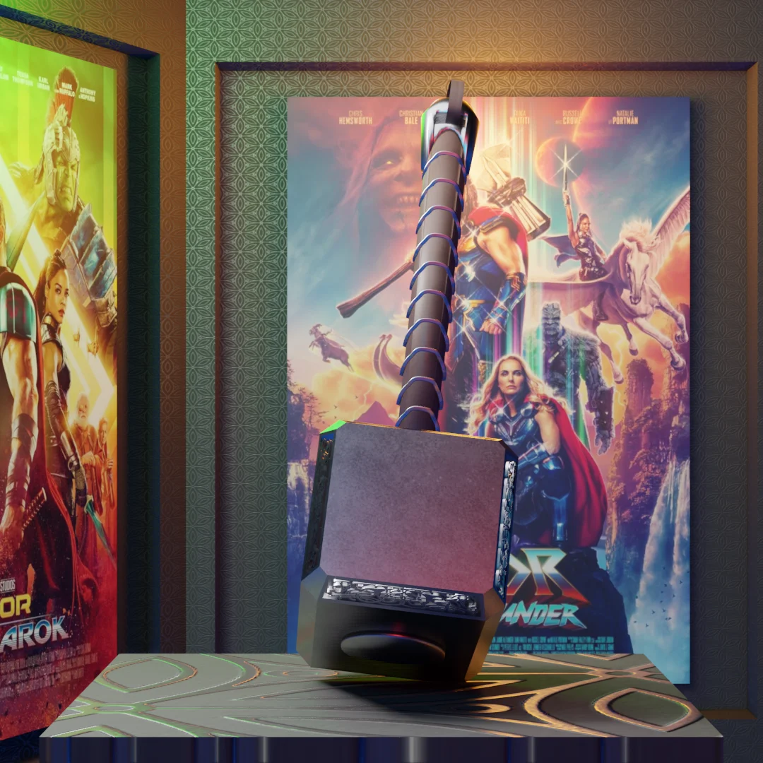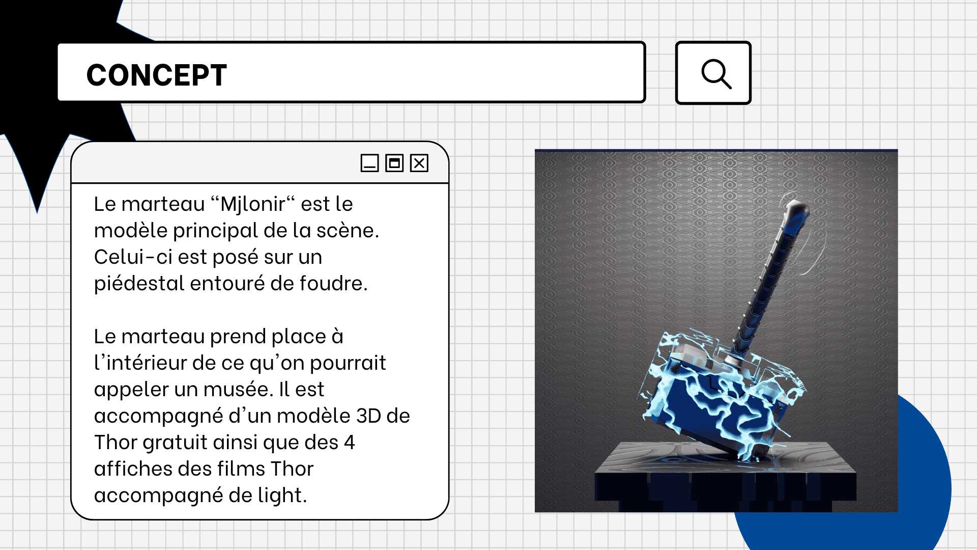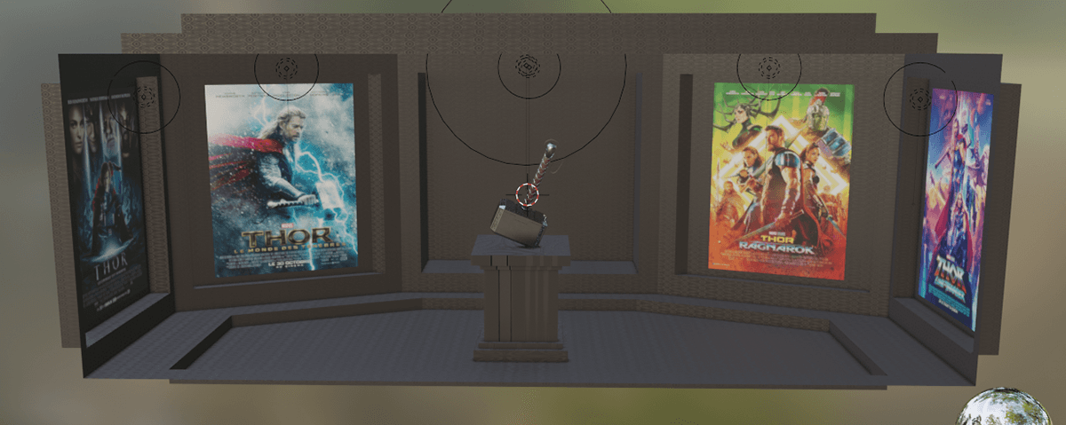 Afin de mettre en valeur le marteau, j’ai choisi de l’exposer sur un piédestal, à la manière d’un objet de collection. L’environnement est complété par un modèle 3D libre de droit de Thor (issu de Sketchfab) ainsi que par des posters des quatre films Thor, renforçant l’idée d’un mini musée dédié au personnage.