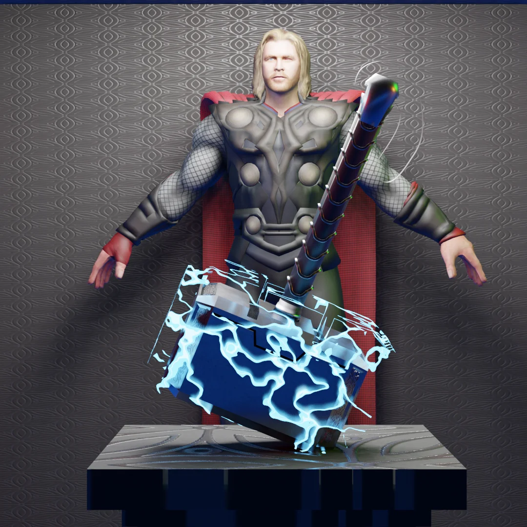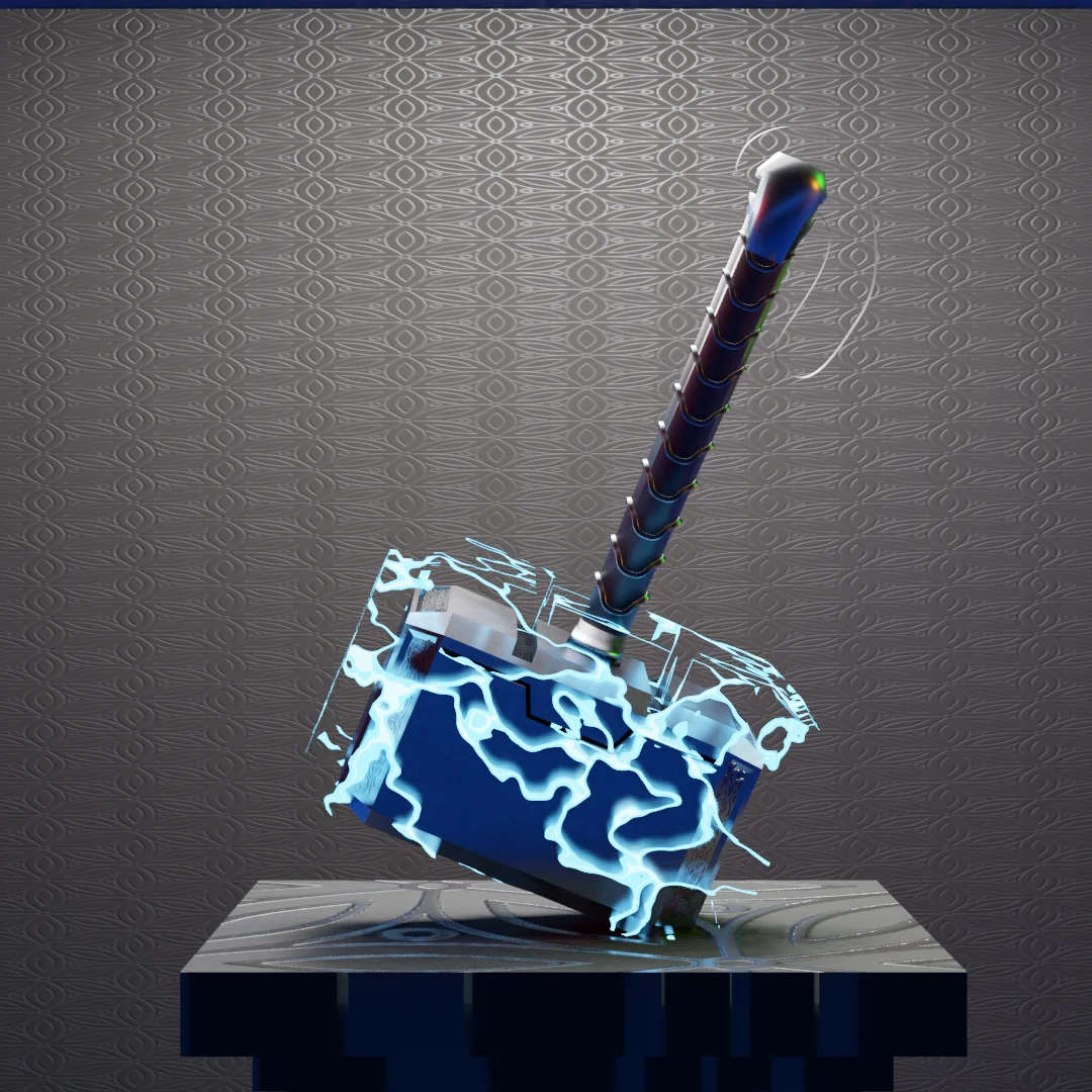 Pour certaines parties techniques, comme la sangle ou l’effet d’éclair entourant le marteau, je me suis appuyé sur des tutoriels YouTube, ces éléments représentant de nouveaux défis dans mon apprentissage de la 3D. Cette démarche m’a permis d’élargir mes compétences tout en intégrant ces effets de manière crédible dans la scène.